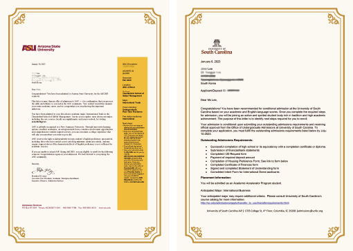 토플 : 96점Arizona State University ,The University of Illinois at Chicago, University of Utah, University of South Carolina 등 합격